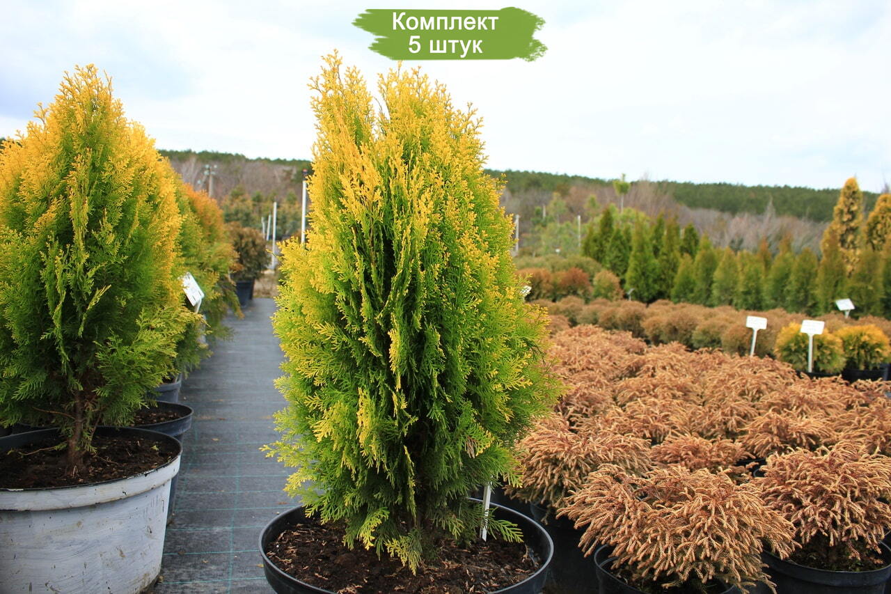 Комплект туй Восточных, размером от 40 до 60 см, включает 5 растений по цене 4. Эти деревья могут достигать в высоту до 18 метров, хотя чаще встречаются экземпляры высотой до 10 метров. Крона туи обширна, её ширина может равняться 11 метрам. Кора у туи тёмно-коричневая, в то время как ветви могут быть окрашены в жёлтые или красные тона.