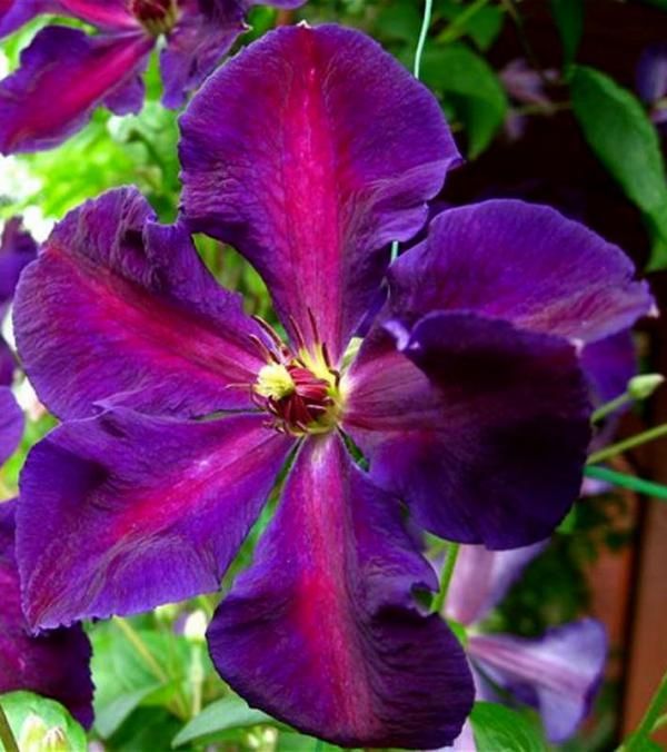 Клематис "Тучка" - это уникальный сорт с крупными, темно-пурпурными цветками, украшенными шелковистыми лепестками и красно-пурпурной полосой посередине. Тычинки имеют фиолетовые пыльники на белых нитях, что придает цветкам особую изысканность. Этот сорт особенно эффектно смотрится на светлом фоне, когда его высаживают у решеток, сеток и других садовых опор. Он также может виться по высоким лиственным или хвойным кустарникам, создавая живописные композиции.